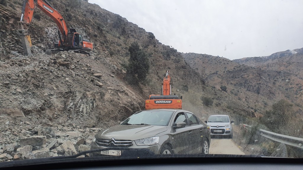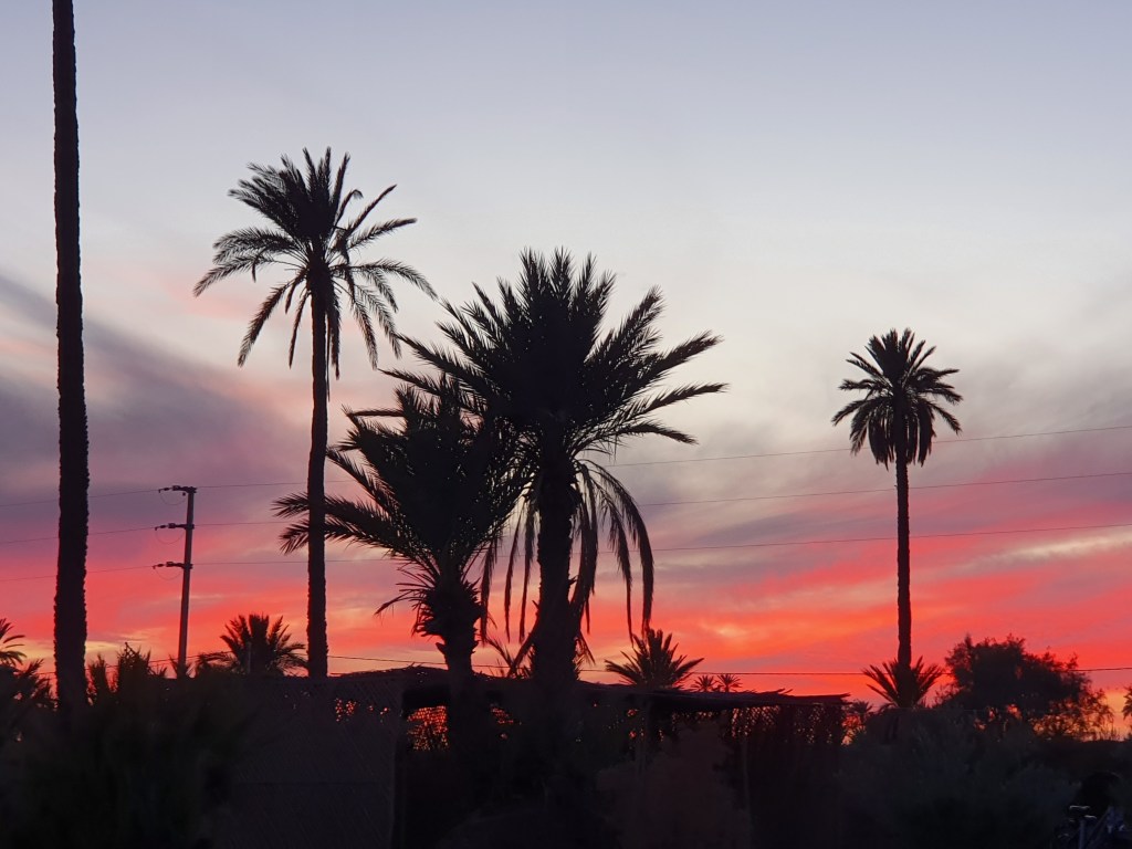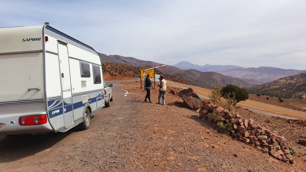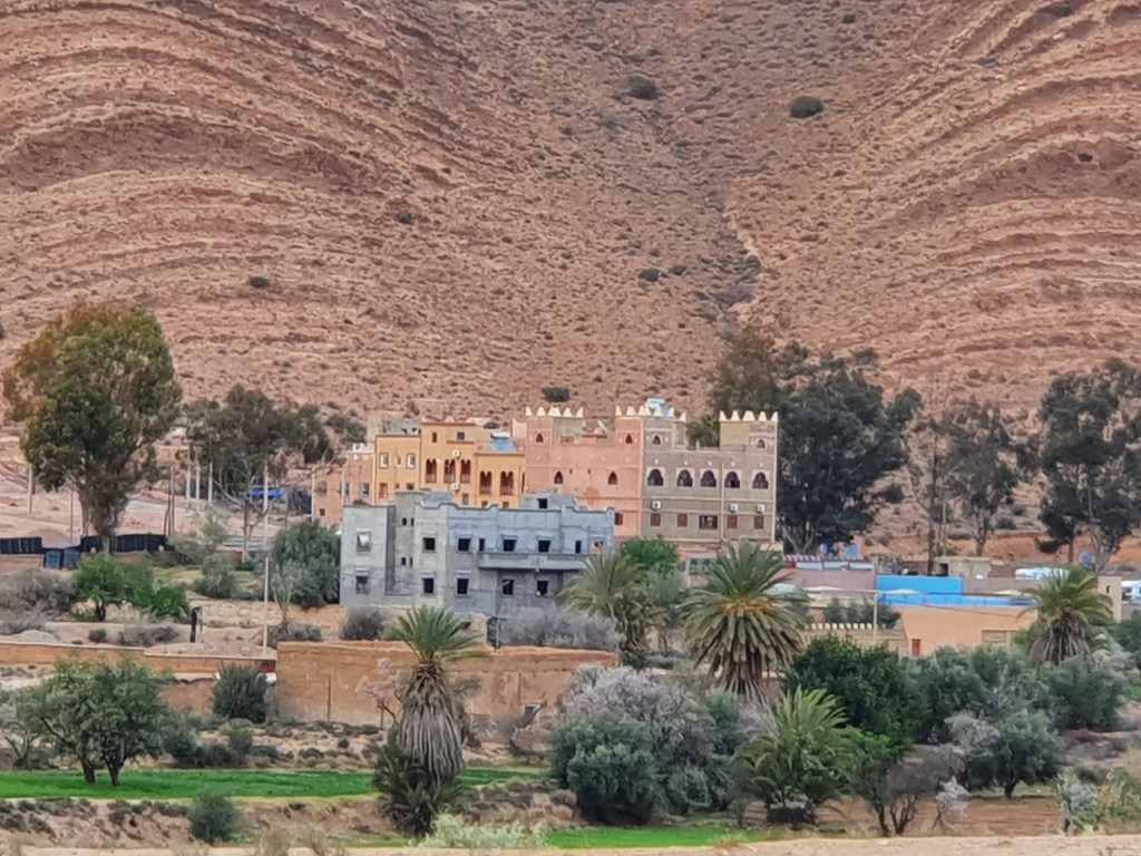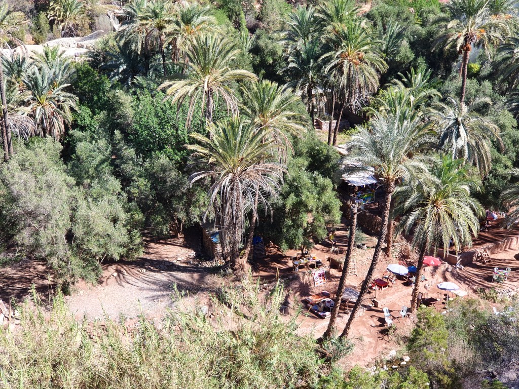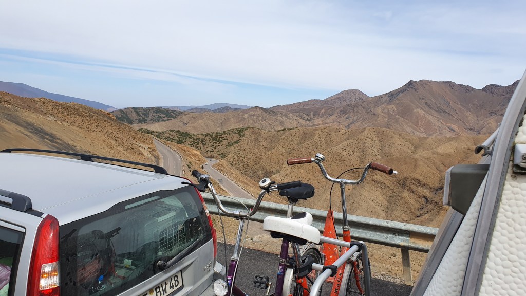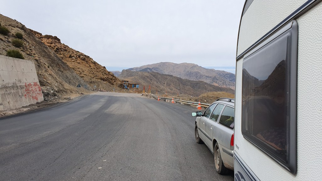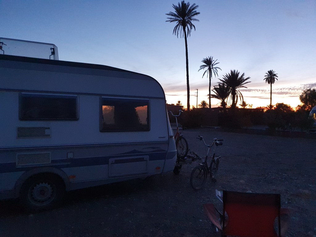 Ouarzazate ist die Filmmetropole von Marokko. Viele große Filme mit Wüstenatmosphäre sind hier entstanden. Gladiator, Laurence von Arabien u.a.. Ouarzazate ist durch die Filmbranche und die Atlas Studios die am schnellsten wachsende Stadt südlich des Atlasgebirges. Von Ouarzazate geht die Straße nach Norden über den Hohen Atlas. Auf der anderen Seite liegt Marrakesch. Es sind 180 km Entfernung aber wir brauchen letztlich 7 Stunden dafür. Die Nationalstraße soll gut ausgebaut sein aber wir hören das sie vor einigen Tagen gesperrt war. Auf unserer Fahrt gibt es andauernd Baustellen und wir fahren viele Kilometer auf Lehmpisten und werden kräftig durchgerüttelt. Es hat wohl Steinlawienen gegeben. Die Leitplanken sind teilweise verbogen oder weggerissen. Die Straße zur Abhangseite weggebrochen. Die Landschaft ist atemberaubend schön und bietet wunderschöne Farben an den Felshängen. Beinahe greifbar sind die Schneefelder auf 2260 m Passhöhe des Tiz’n’Tickla. Gegen Abend erreichen wir das Ourika Camp am Stadtrand von Marrakesch und blicken von unten auf die schneebedeckten Gipfel des Atlas. Fotos sind nicht so viele entstanden und eher in den entspannten Situationen.