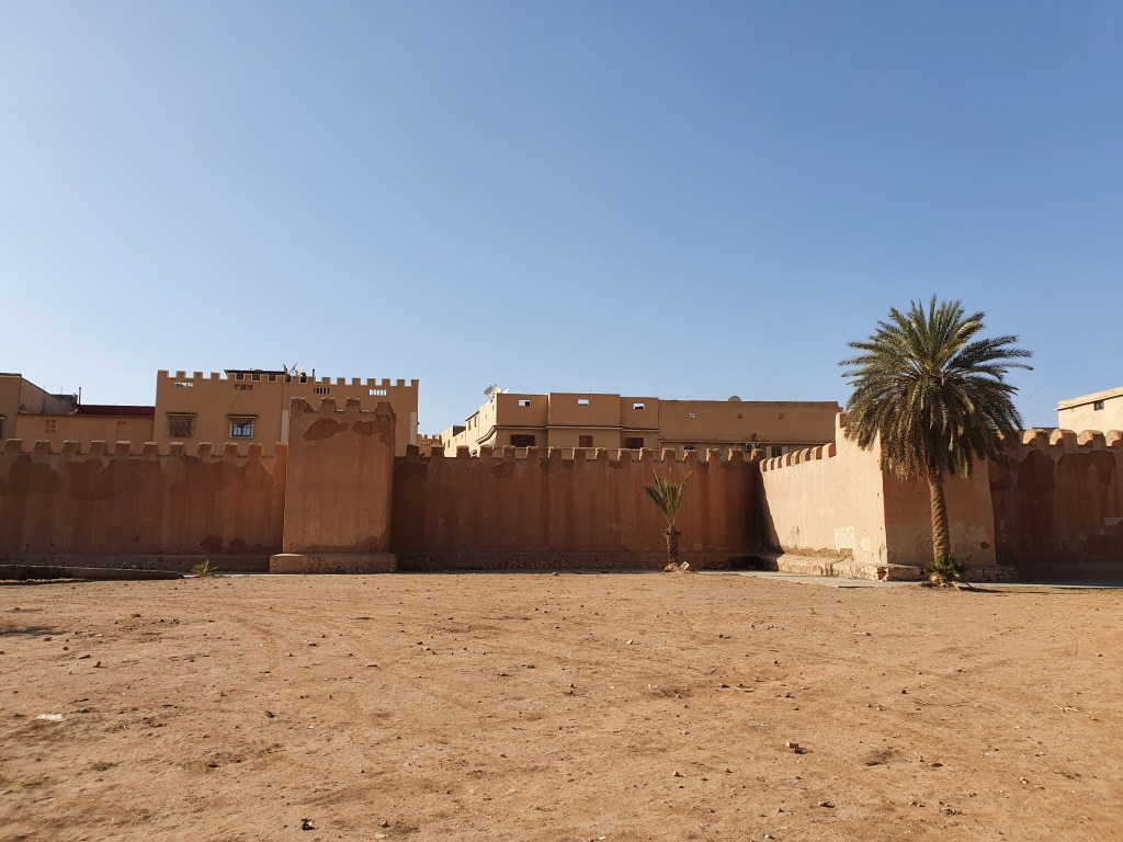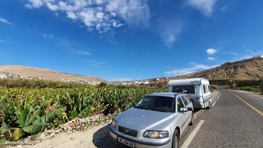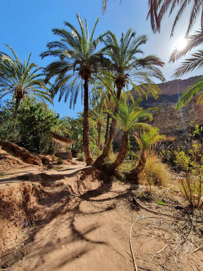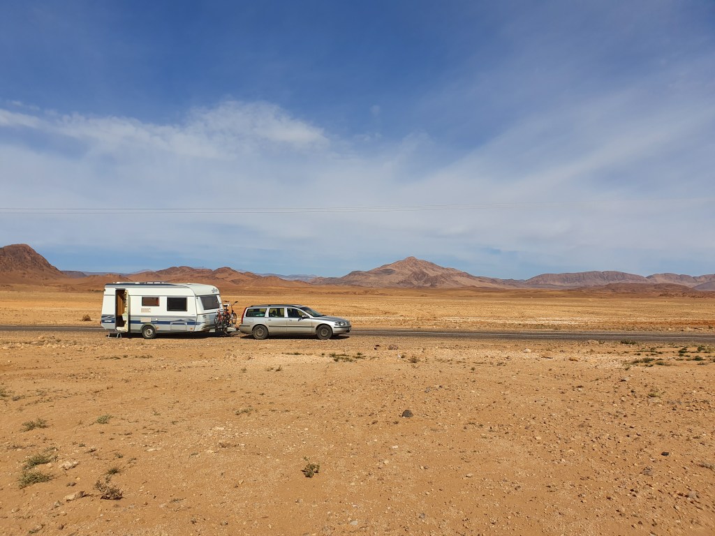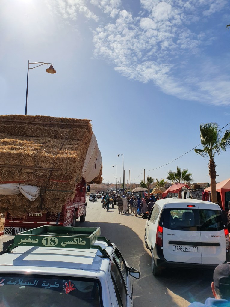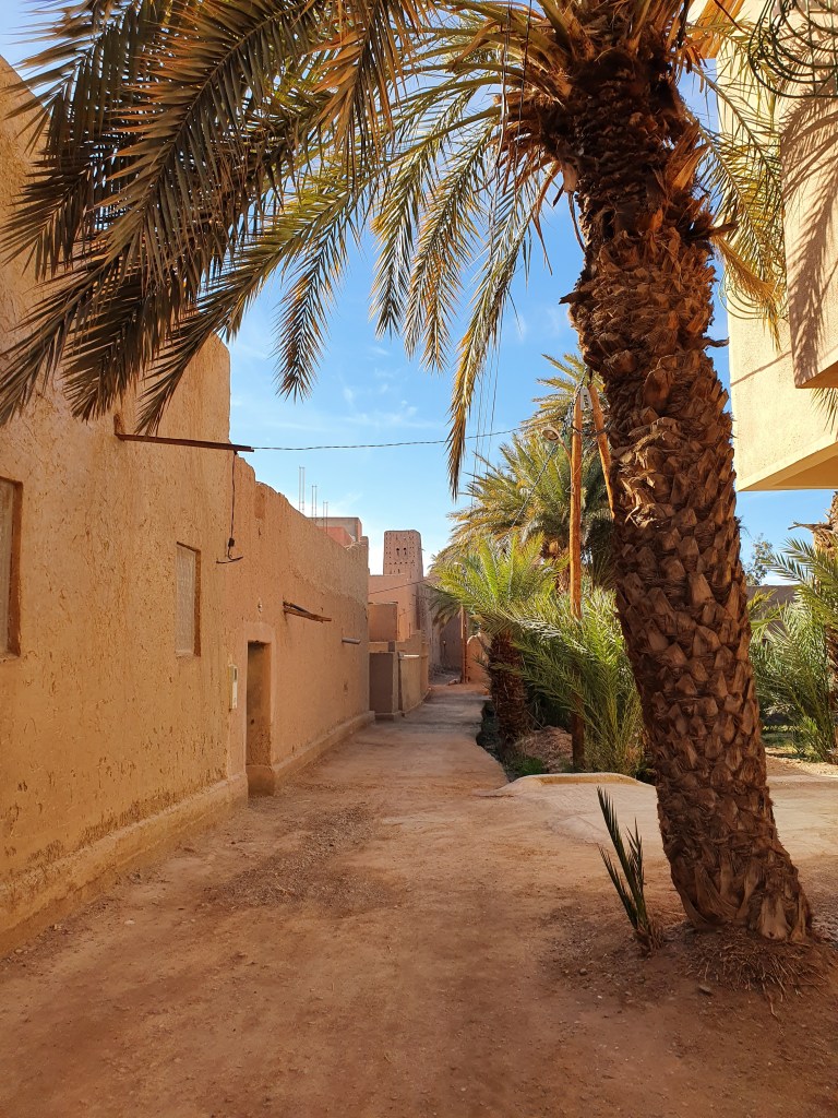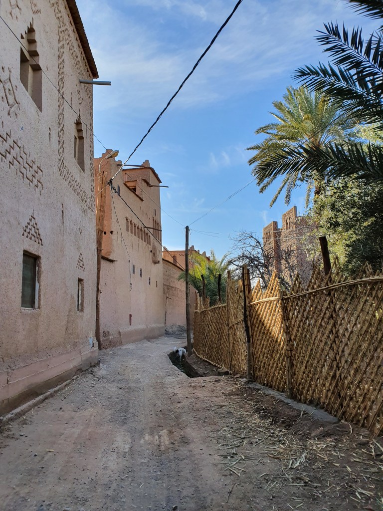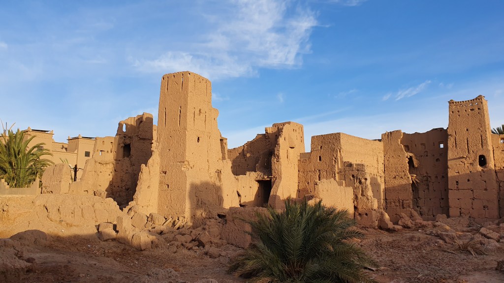 Ouarzazate ist die Filmmetropole von Marokko. Viele große Filme mit Wüstenatmosphäre sind hier entstanden. Gladiator, Laurence von Arabien u.a.. Ouarzazate ist durch die Filmbranche und die Atlas Studios die am schnellsten wachsende Stadt südlich des Atlasgebirges. Von Ouarzazate geht die Straße nach Norden über den Hohen Atlas. Auf der anderen Seite liegt Marrakesch. Es sind 180 km Entfernung aber wir brauchen letztlich 7 Stunden dafür. Die Nationalstraße soll gut ausgebaut sein aber wir hören das sie vor einigen Tagen gesperrt war. Auf unserer Fahrt gibt es andauernd Baustellen und wir fahren viele Kilometer auf Lehmpisten und werden kräftig durchgerüttelt. Es hat wohl Steinlawienen gegeben. Die Leitplanken sind teilweise verbogen oder weggerissen. Die Straße zur Abhangseite weggebrochen. Die Landschaft ist atemberaubend schön und bietet wunderschöne Farben an den Felshängen. Beinahe greifbar sind die Schneefelder auf 2260 m Passhöhe des Tiz’n’Tickla. Gegen Abend erreichen wir das Ourika Camp am Stadtrand von Marrakesch und blicken von unten auf die schneebedeckten Gipfel des Atlas. Fotos sind nicht so viele entstanden und eher in den entspannten Situationen.